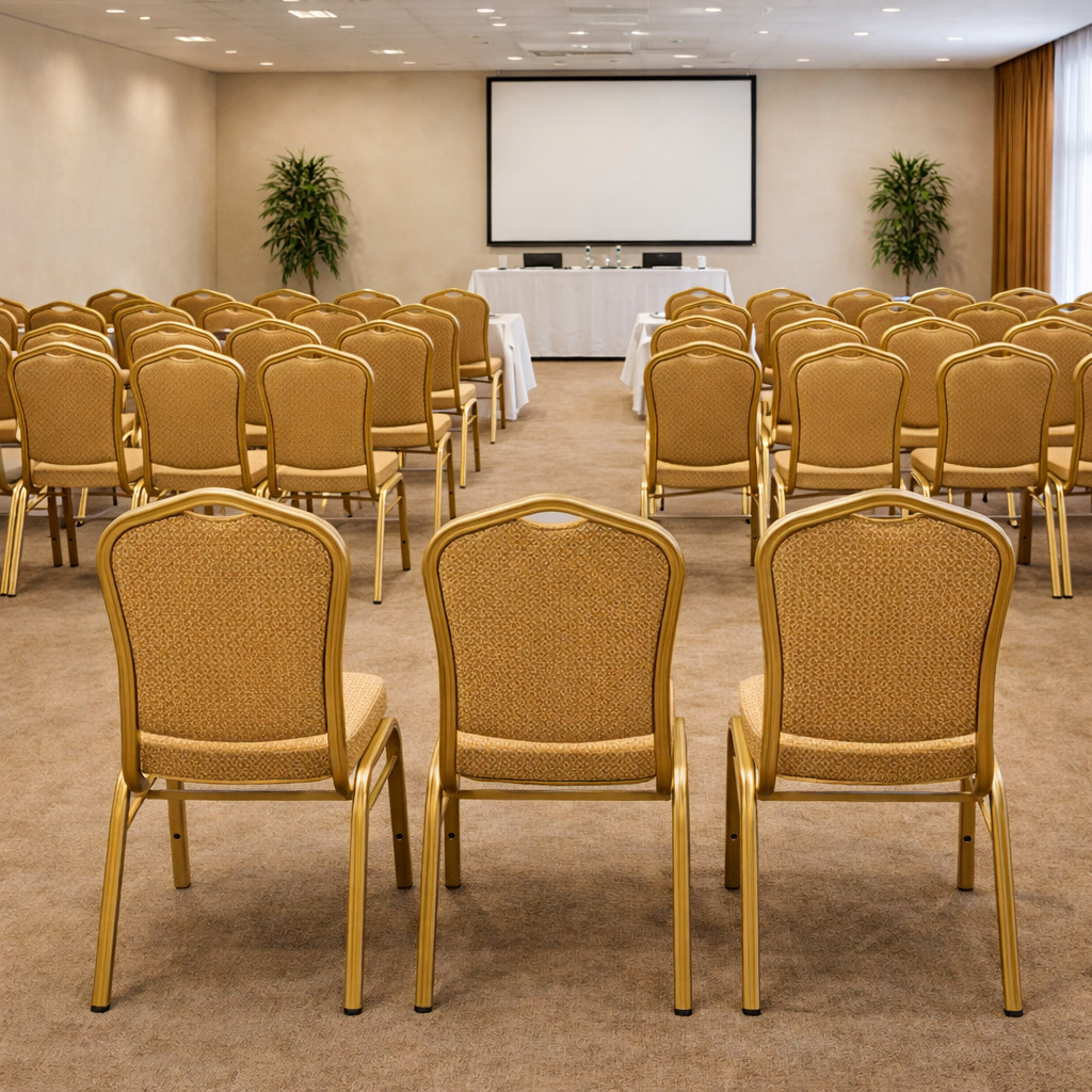 Farbe: gold/ KaramellHALLSEAT Stühle sind elegant, massiv, haben eine lange Lebensdauer und sind auch günstig. Sie sind ideal für den intensiven Gebrauch und eine geeignete Lösung für Bankett- und Konferenzräume, Hotels oder Restaurants. Der Vorteil ist, dass die Stühle stapelbar sind, deswegen kann man auf kleinem Platz lagern.