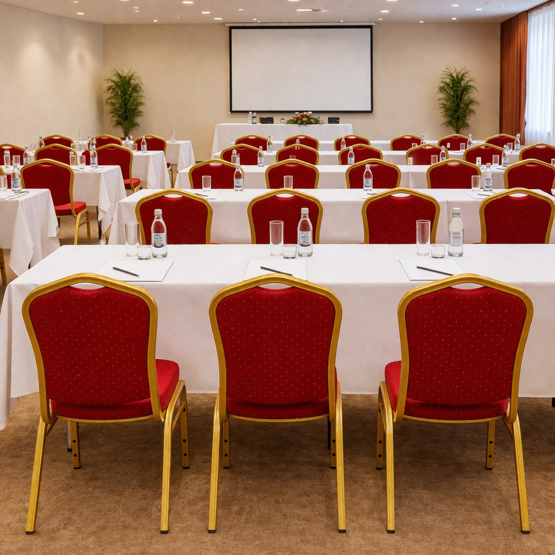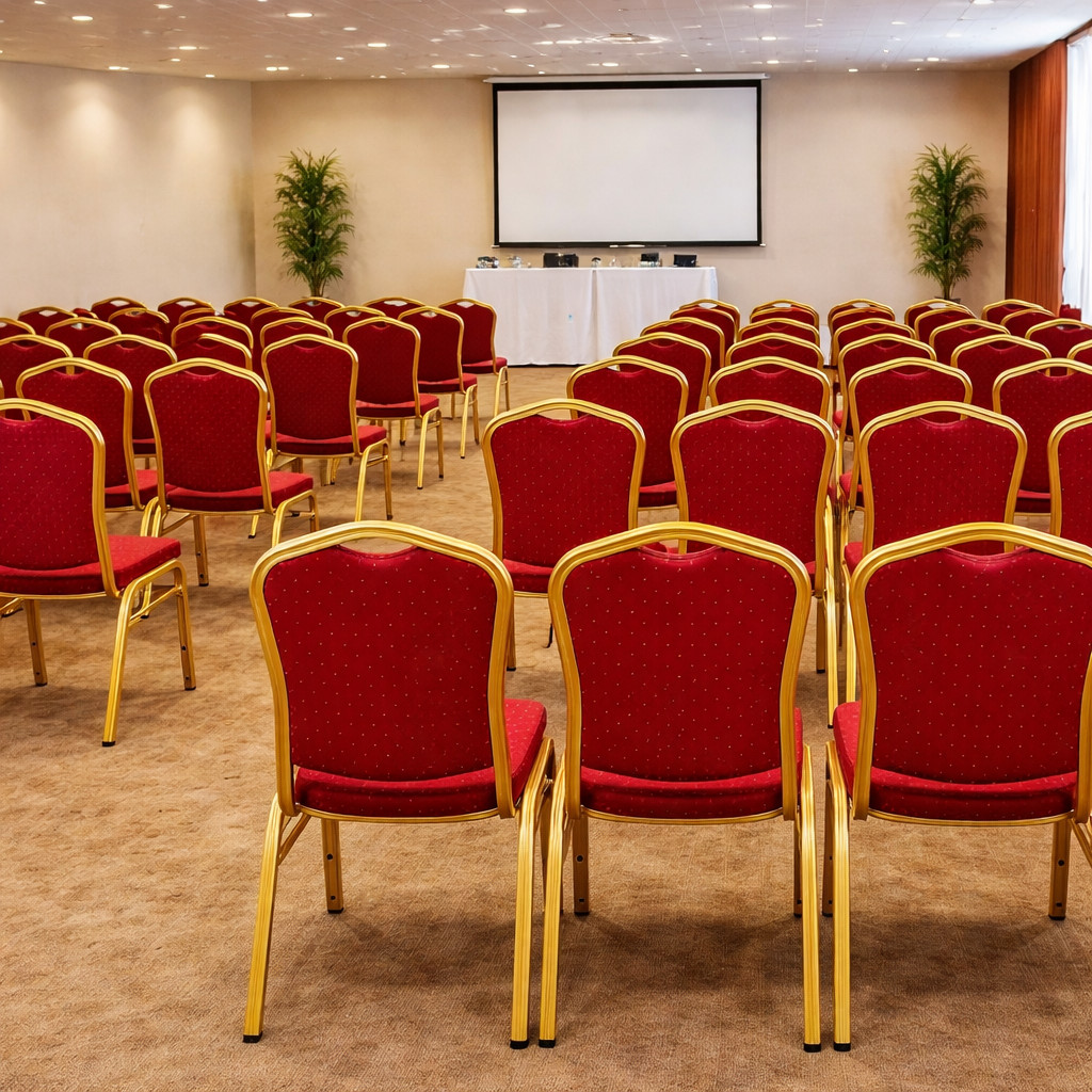 Farbe: gold/ rotHALLSEAT Stühle sind elegant, massiv, haben eine lange Lebensdauer und sind auch günstig. Sie sind ideal für den intensiven Gebrauch und eine geeignete Lösung für Bankett- und Konferenzräume, Hotels oder Restaurants. Der Vorteil ist, dass die Stühle stapelbar sind, deswegen kann man auf kleinem Platz lagern.