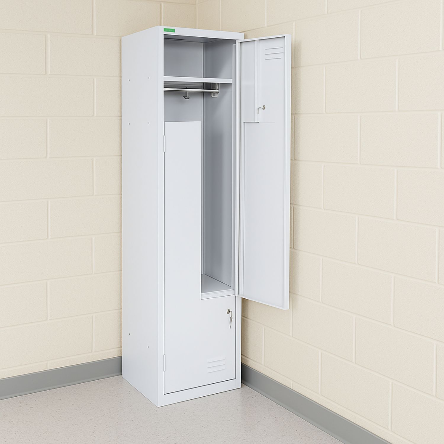 - Grundausstattung: Kleiderstange und Haken zum Aufhängen von Kleidung, Türschlitzen wegen Belüftung, Sicherheitsschloss (mit 2 Schlüsseln), niedriger Sockel für mehr Platz im Schrank.