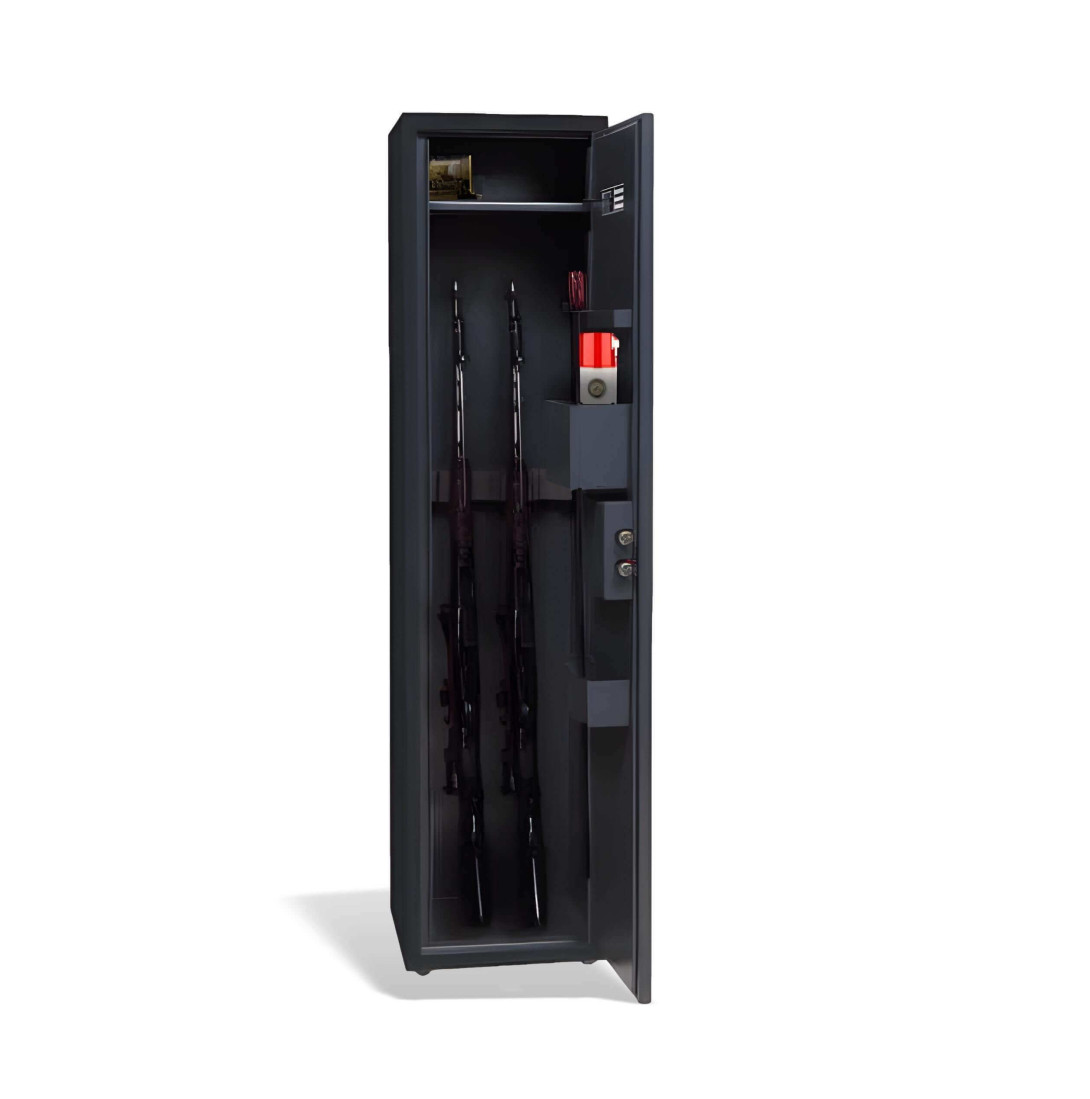 Der Schrank ist mit einem Schlüssel abschließbar und ermöglicht die sichere Aufbewahrung von 3 Waffen mit einer maximalen Länge von 1060 mm. Der Schrank verfügt über ein internes Regal, das so tief ist wie der Schrank selbst, und praktische Zusatzeinrichtungen an der Tür: Halterungen für Munition, Dokumente, Magazine, Ballistol (Spray), Fernglas oder anderes Zubehör. Der Schrank ist in einer elegantenAnthrazitfarbe (RAL 7016) mit einem Innenvolumen von 68 Litern erhältlich. Die Türstärke beträgt 2,4 mm und im Boden des Schranks befindet sich eine Schwammeinlage, die ein Verrutschen der Waffen verhindert.