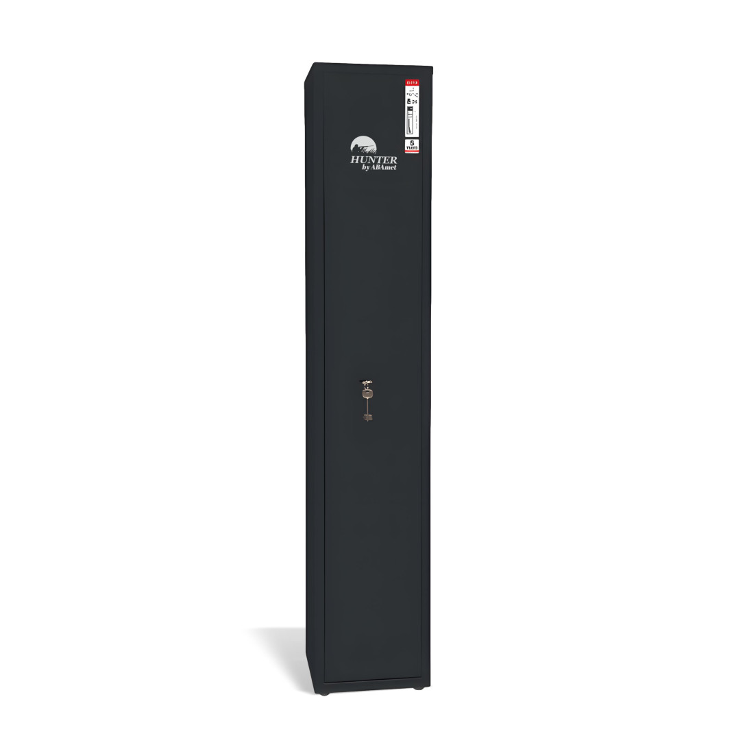 Im Inneren dieses Schranks finden Sie einen abschließbaren Schrank mit einem Regal undTürhalterungen. In diesen Tresor passen 4 Gewehre mit einer maximalen Gewehrlänge von 1260 mm. Sie schließen ihn mit einem Schlüsselschloss ab.