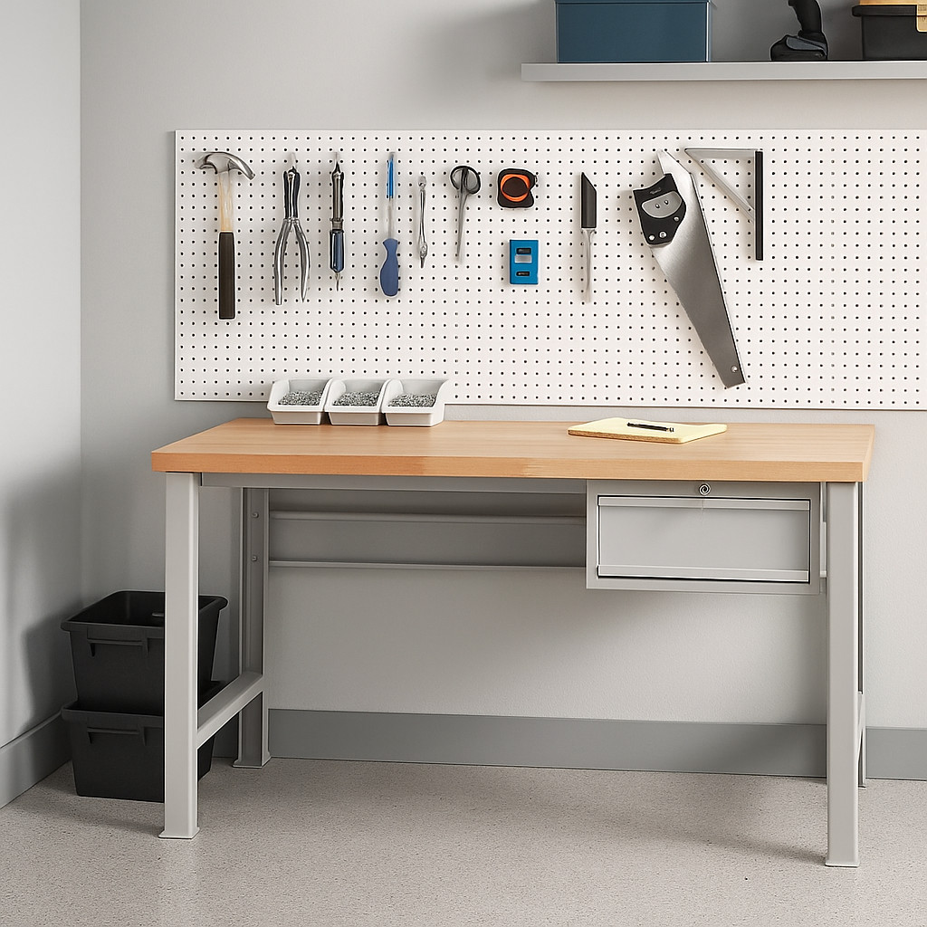Kompakt, robust und zuverlässig – die 1500 mm lange Werkbank ist die ideale Lösung für Werkstätten, Servicestationen, Produktionsstätten und private Garagen. Ihre stabile Stahlkonstruktion aus 2,5–3,0 mm dickem Blech und die massive, 40 mm dicke Buchenholzplatte garantieren Stabilität, Langlebigkeit und eine lange Lebensdauer auch im täglichen Gebrauch.
