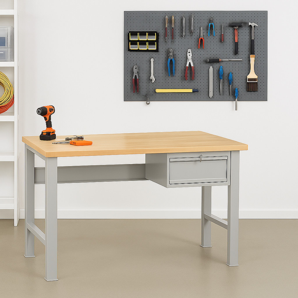 Diese Werkbank vereint robuste Konstruktion, eine großzügige Arbeitsfläche und praktischen Stauraum – ideal für Profis und Heimwerker.
