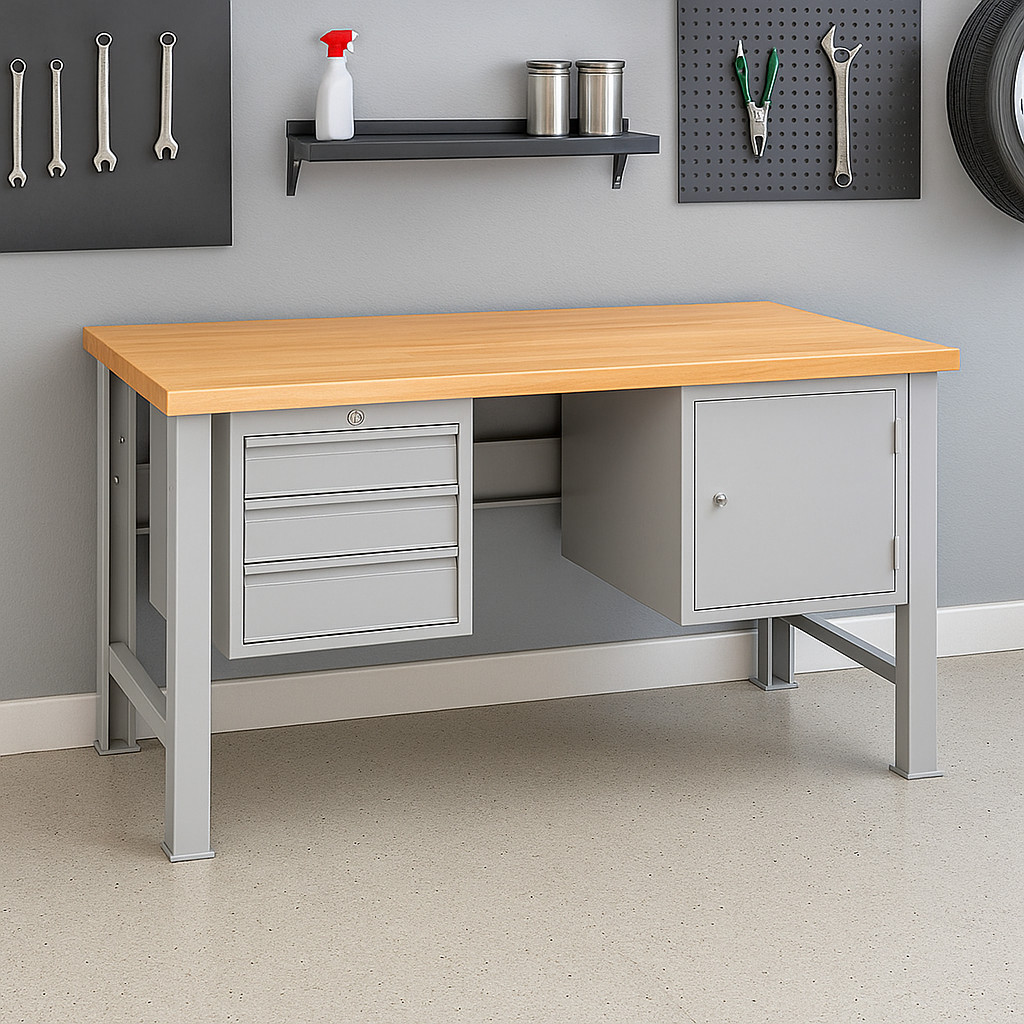 Kompakt, robust und zuverlässig – diese Werkbank mit einer 1500 mm langen und 40 mm starken Buchenholzplatte ist die ideale Wahl für Werkstätten, Garagen und professionelle Anwendungen, bei denen Langlebigkeit und Stabilität gefragt sind. Die Stahlbeine aus 2,5–3,0 mm starkem Blech garantieren in Kombination mit der massiven Tischplatte eine Tragfähigkeit von bis zu 500 kg, sodass die Werkbank auch anspruchsvollen Arbeitsbedingungen problemlos standhält.