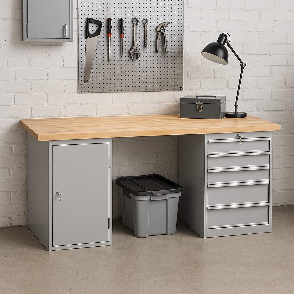 Der Tisch mit einer Tragkraft von bis zu 500 kg ist mit einem 5-Schubladen-Schrank und einem 1-türigen Schrank mit zwei Einlegeböden ausgestattet, die aus 0,7–0,8 mm starkem Stahlblech gefertigt sind. Jede Schublade hat eine Tragkraft von 40 kg, einen Vollauszug auf Kugellagern und ist mit einem Zylinderschloss abschließbar, was eine sichere und übersichtliche Aufbewahrung von Werkzeugen oder Kleinteilen ermöglicht. Der Schrank mit Einlegeböden bietet zudem praktischen Platz für größere Gegenstände.