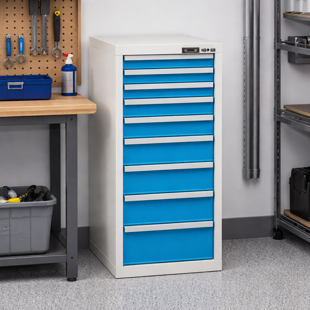 Dank neun unterschiedlich großer Schubladen mit blauer Front bietet der Container flexible Aufbewahrungsmöglichkeiten für Kleinwerkzeuge, Befestigungsmaterial und Bürobedarf. Die robuste Konstruktion aus hochwertigem Stahlblech garantiert Stabilität und lange Lebensdauer. Die perforierte Innenseite mit 25 mm Abstand ermöglicht die werkzeuglose und einfache Justierung der Schubladenführungen – exakt nach Bedarf.