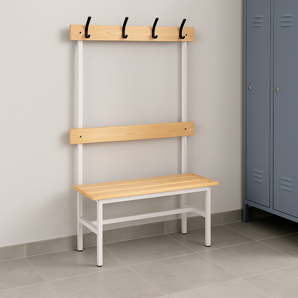 - Umkleidesitzbank doppelseitig mit Rücklehne und Haken, Lange 1000 mm