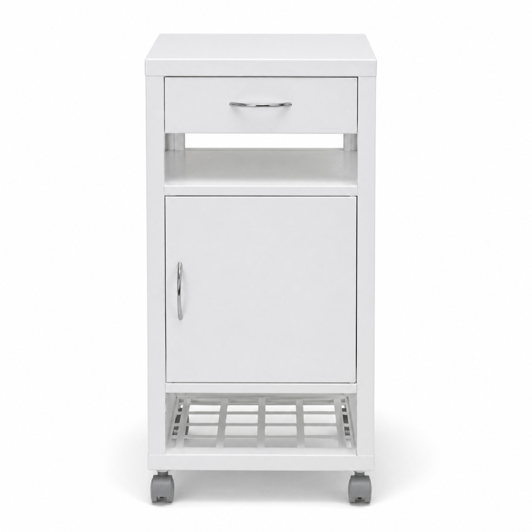 Der Stauraum ist übersichtlich aufgeteilt und umfasst eine Schublade, einen Schrank mit Tür und ein offenes Ablagefach. Für zusätzlichen Komfort sorgen ein Handtuchhalter und stabile Griffe, die das Bewegen und die Nutzung im Alltag erleichtern.