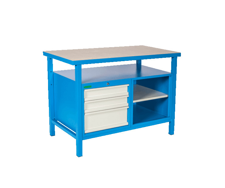 - Arbeitsplatte: Verleimtes Fichtenholz, beidseitig furniert mit Buchensperrholz mit einer Stärke von 40 mm